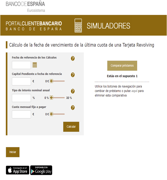 Para finalizar el artículo, y al margen de la bibliografía, os adjunto el enlace del simulador del “cálculo de la fecha de vencimiento de la última cuota de una Tarjeta Revolving”, con el que según el Banco de España (al que pertenece el simulador), podréis “obtener información sobre cómo se amortizará la deuda pendiente de tu tarjeta revolving, en una determinada fecha y para una cuota mensual”. El plazo de amortización previsto, por si algún lector no sabe lo que es “cuándo terminarás de pagar la deuda si no se realizasen más disposiciones ni se modificase la cuota”.
