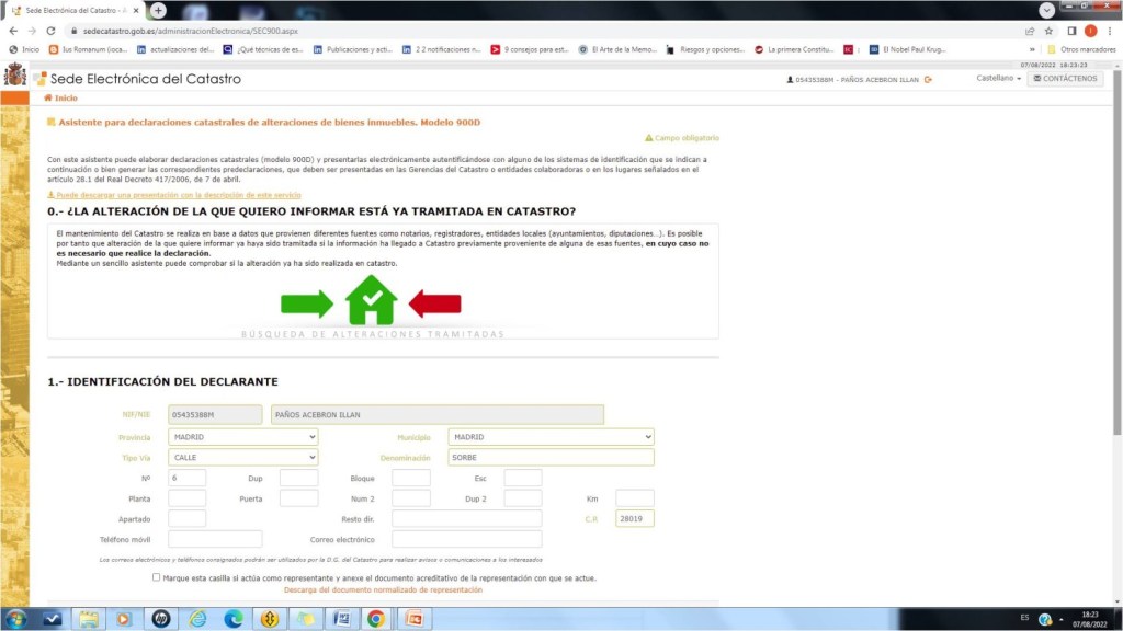 En este artículo expondré una guía de la declaración de alteración catastral de los bienes inmuebles (Modelo 900D), que sirve (entre otras cosas) para declarar el cambio de la titularidad en el catastro, y que es un proceso que realizo habitualmente (cambiar la titularidad) en el trabajo, normalmente acompañado de la tramitación del IIVTNU (Impuesto sobre el Incremento del Valor de los Terrenos de Naturaleza Urbana, conocido como plusvalía), que analizaré en otra ocasión, ya sea de forma individual, únicamente estos dos procesos (normalmente para la gestión de la venta de inmuebles de una empresa, habitualmente plazas de garaje),o bien como parte de la tramitación de herencias (dado que en los inmuebles, al tramitar las herencias, por ejemplo pisos o fincas rústicas, también hay que alterar su titularidad en el catastro).