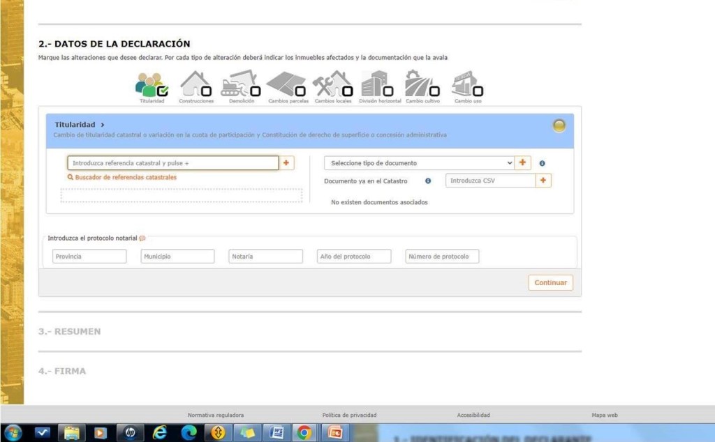 Si os fijáis, al comienzo, hay un apartado que pone “Puede descargar una presentación con la descripción de este servicio”, es un pdf que contiene un manual de instrucciones que este y que recomiendo leer, (https://www.catastro.minhap.es/ayuda/asistente_declaraciones_catastrales_ciudadanos.pdf), no obstante os explicaré un poco que hay que hacer en cada apartado, bajo el supuesto de un cambio de titularidad catastral.