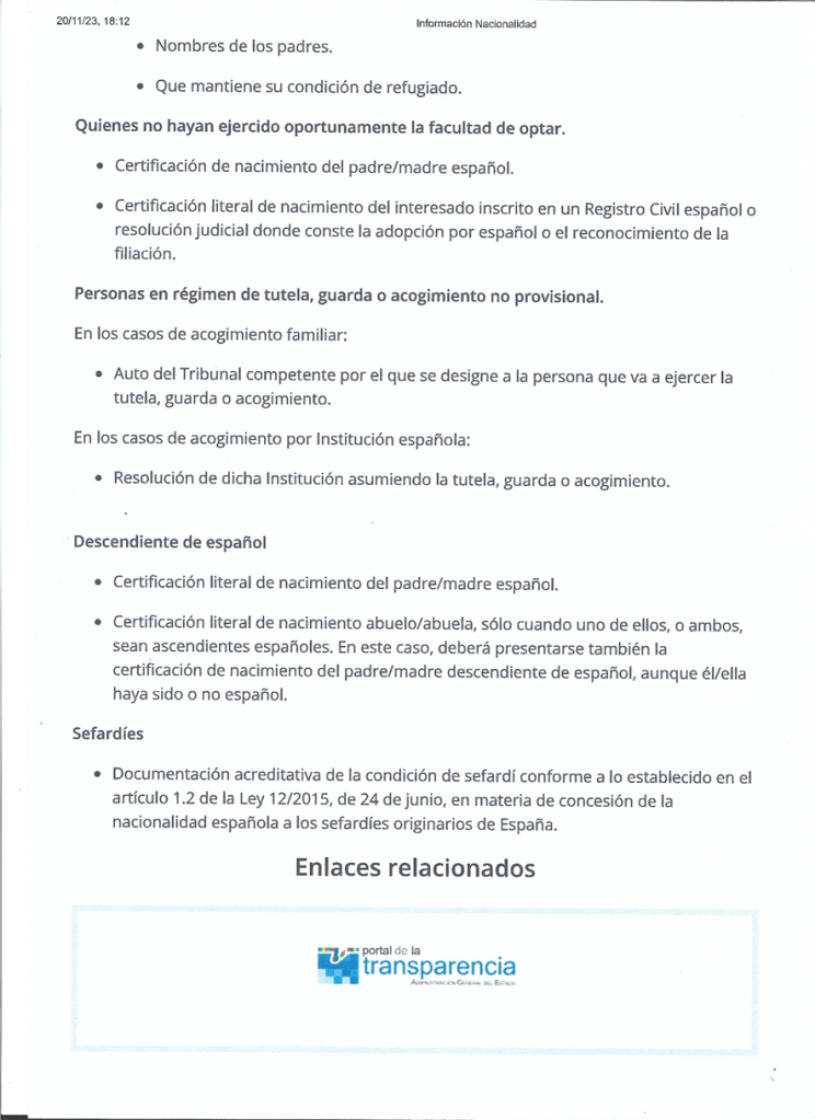 - Documentación acreditativa de la condición de sefardí conforme a lo establecido en el artículo 1.2 de la Ley 12/2015, de 24 de junio, en materia de concesión de la nacionalidad española a los sefardíes originarios de España”.