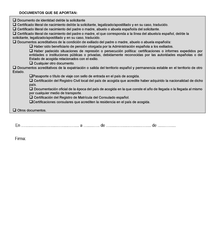 En relación a este apartado, hay que rellenar el Anexo III ( https://www.exteriores.gob.es/Documents/DocumentosSC/Nacionalidad/Anexo%203.pdf ), con la documentación que se menciona en el Anexo.