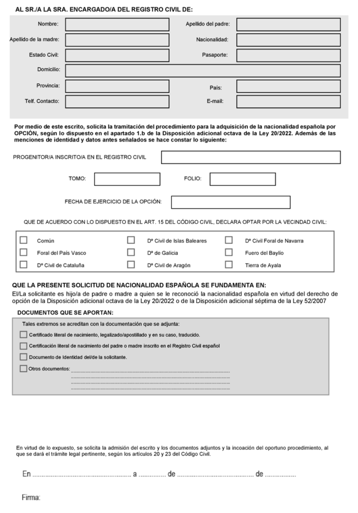ANEXO I, Modelo de solicitud de la nacionalidad española por opción, (Apartado 1 párrafo primero disposición adicional 8.ª de la Ley 20/2022)