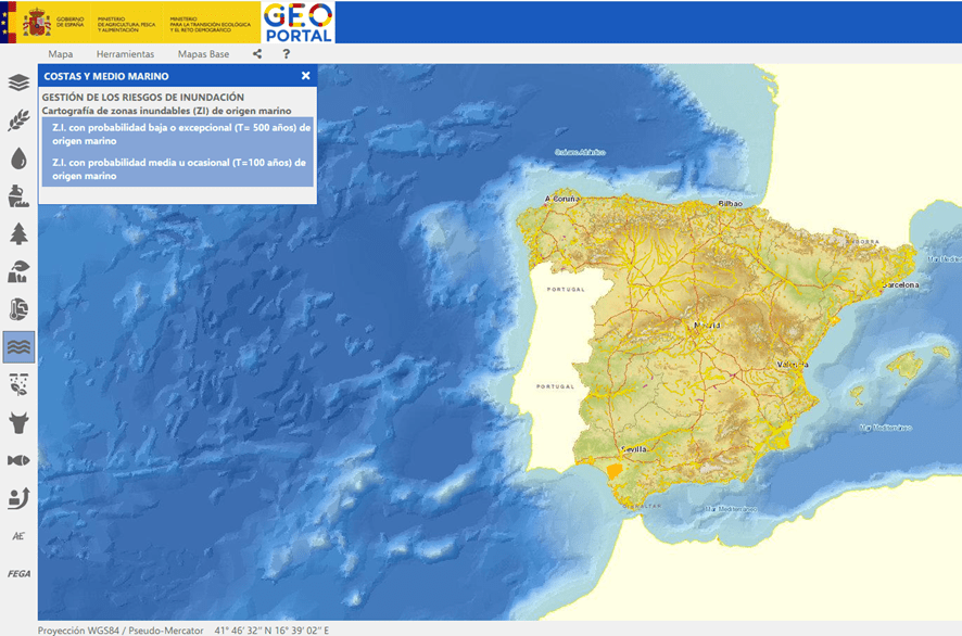Para inundaciones marinas, hay que pulsar en Costas y Medio Marino, Gestión de los riesgos de inundación, Cartografía de zonas inundables (ZI) de origen marino, (Probabilidad Media u Ocasional 100 años, Probabilidad Baja o Excepcional 500 años).