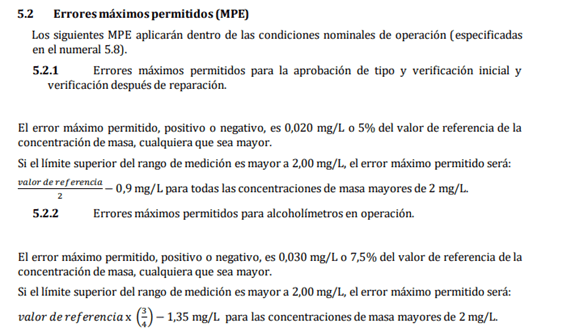 Respecto al margen de error, dicha orden remite a la Recomendación OIML R 126, del cual adjunto una captura de pantalla de dicha recomendación con el margen de error, no obstante, en internet se pueden encontrar calculadoras sobre dicho margen.
