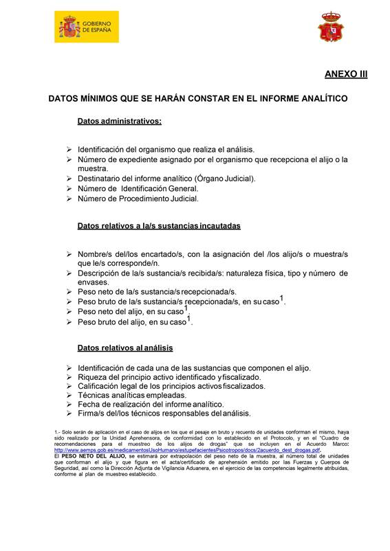 No obstante, primero se va aportar información de la “Guía práctica de actuación sobre la aprehensión, análisis, custodia y destrucción de drogas tóxicas, estupefacientes o sustancias psicotrópicas”, del Gobierno de España, que proporciona información muy útil e interesante sobre este asunto, con un anexo con los datos mínimos que se harán constar en el informe analítico, que adjunto a continuación.