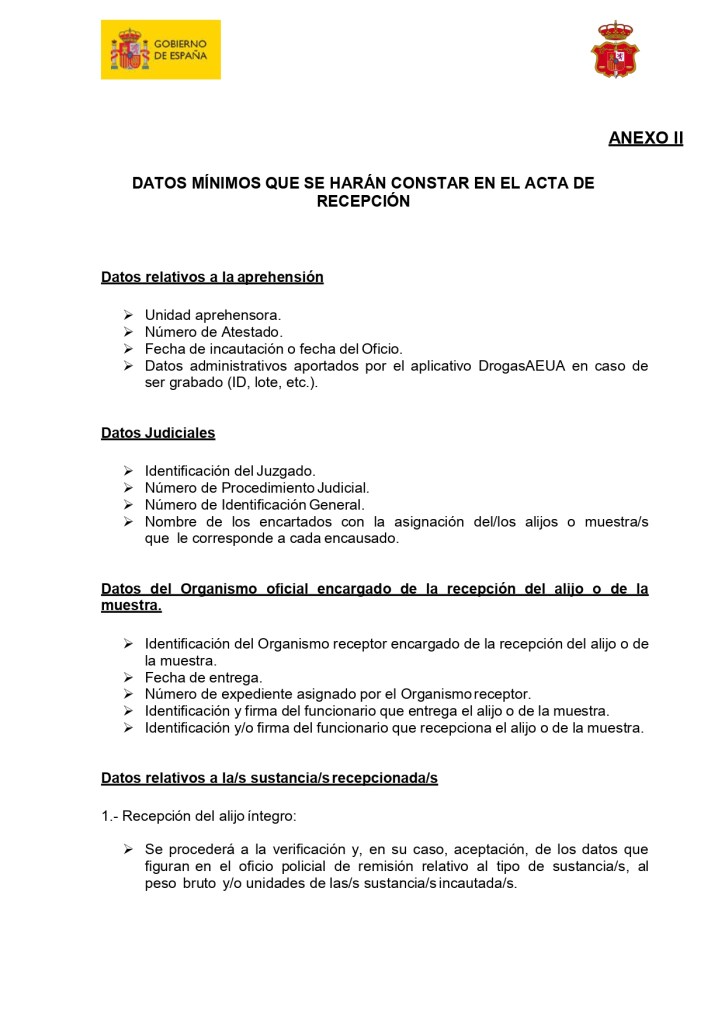 Adjunto la información de la “Guía práctica de actuación sobre la aprehensión, análisis, custodia y destrucción de drogas tóxicas, estupefacientes o sustancias psicotrópicas”, del Gobierno de España, con un anexo con los datos mínimos que se harán constar en el acta de recepción del alijo, que adjunto a continuación.
